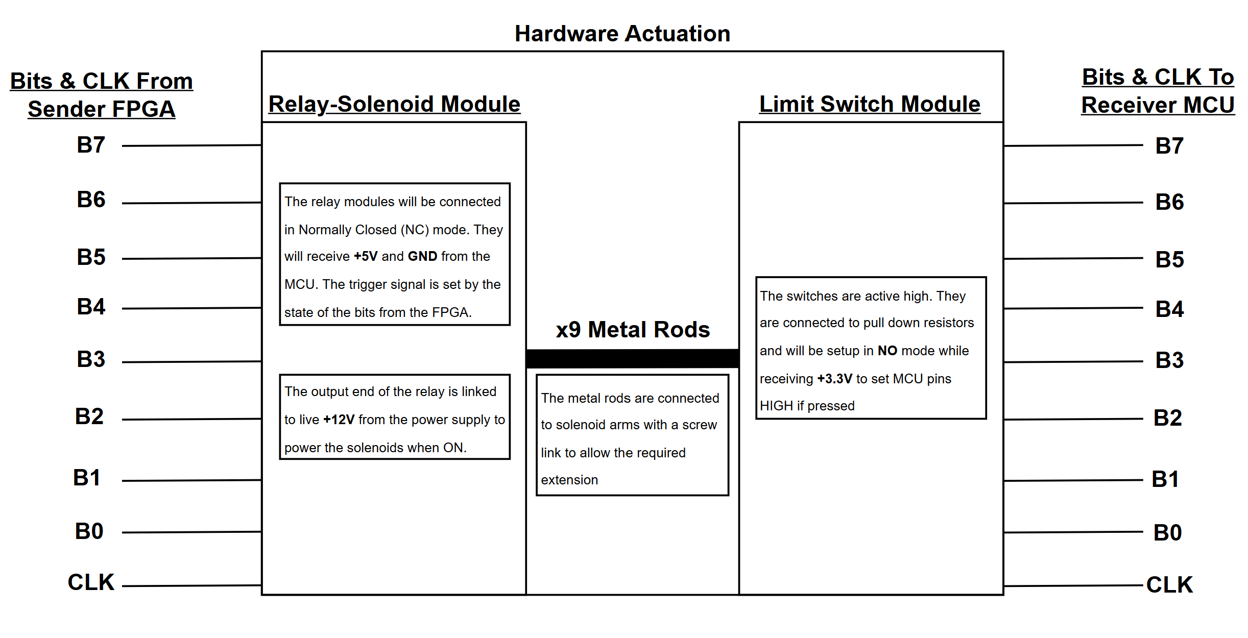 The FPGAs communicate with the MCUs through SPI and interface with the mechanical bus using a custom serial bit driver that handles all data transmission and input reception. The transfer rate of the bits will be set depending on how we synchonize the receiving end. Bit transfer is handled by the clock, and we can change the clock speed to achieve synchronization, and this will in turn affect how fast we can send bits across.