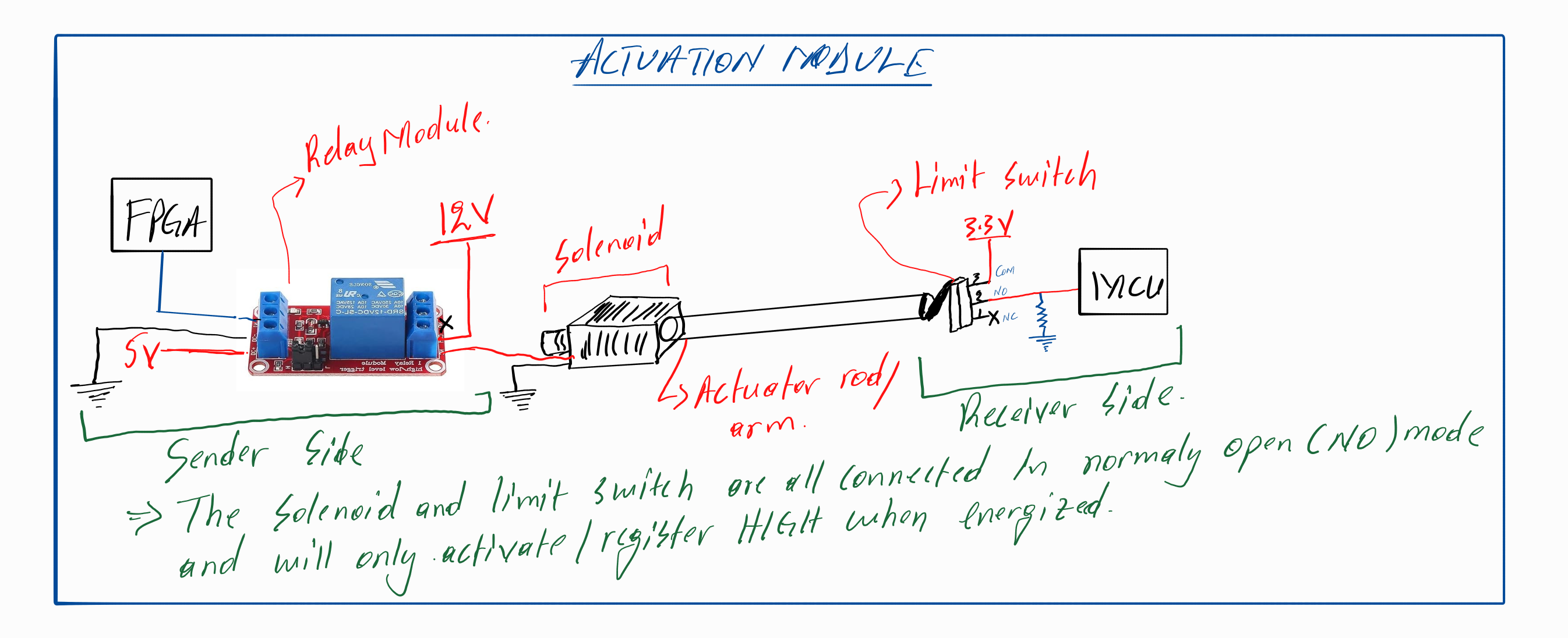 The actuation block requires different modules and setup necessary for it to work as expected. The relay module specifications show the mentioned NO and NC connection modes. Figure 3 below shows the signals as well as voltage and circuit configurations: