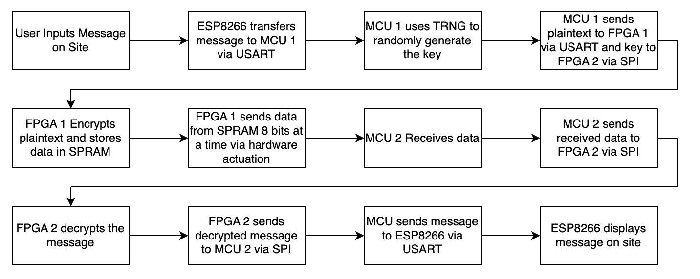 The project uses two MCUs, one for each side of the system. They serve as the main interface for web communication and text encoding, converting messages into byte data that the FPGA can process. MCUs are ideal for this role due to their large on-board memory, which allows them to handle larger text data. Each MCU also participates in the encryption and decryption process, managing the exchange of keys and ciphertext/plaintext with the FPGAs. Additionally, the MCUs will control all system indicators and feedback mechanisms that help monitor the efficiency of the system. The new MCU function is shown below: