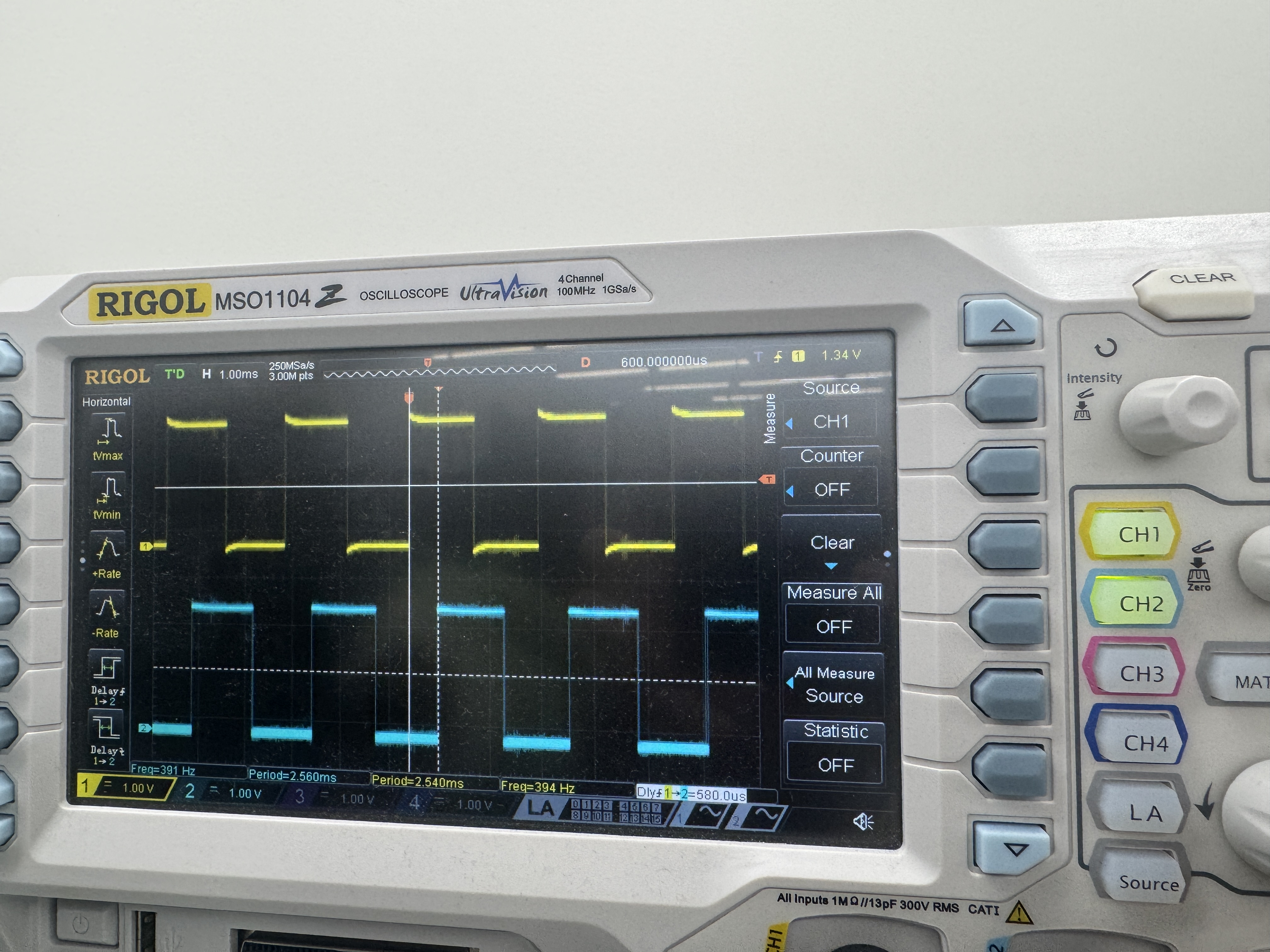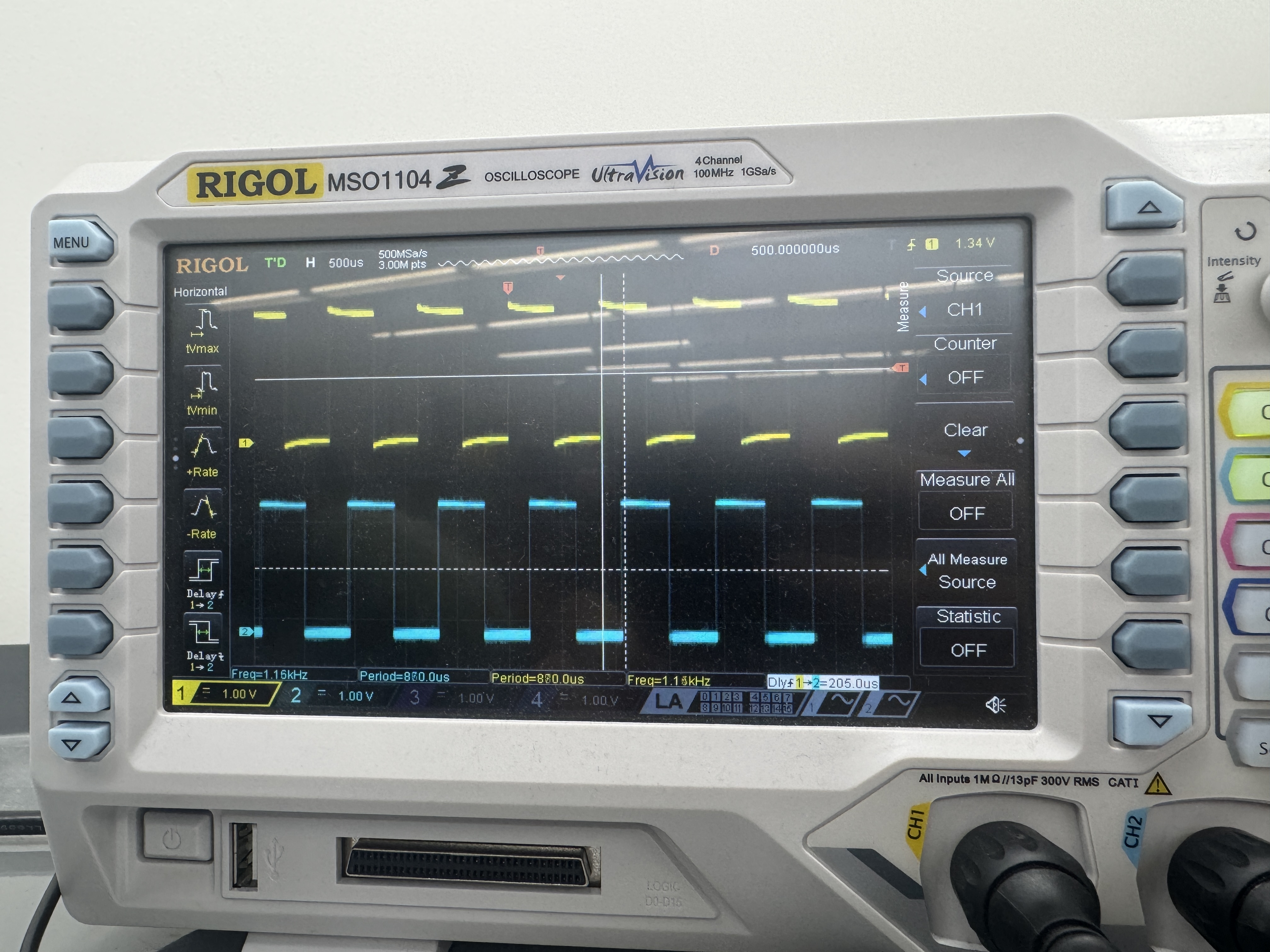 After creating my Segger project and uploading the code to my MCU, I was successfully able to display the direction and speed of the motor. I was able to confirm this by using an oscilloscope to verify that my speed output was correct. To do this, I hooked up both my ASIGNAL_PIN and BSIGNAL_PIN to the oscilloscope and found the time difference between the two signals. I used a spreadsheet to convert that time difference into speed by doing the following formula: speed = 1000000 / (deltaT * 4 * PPR), where speed is in revolutions per second, deltaT is in s, and PPR was 408 pulses per revolution.