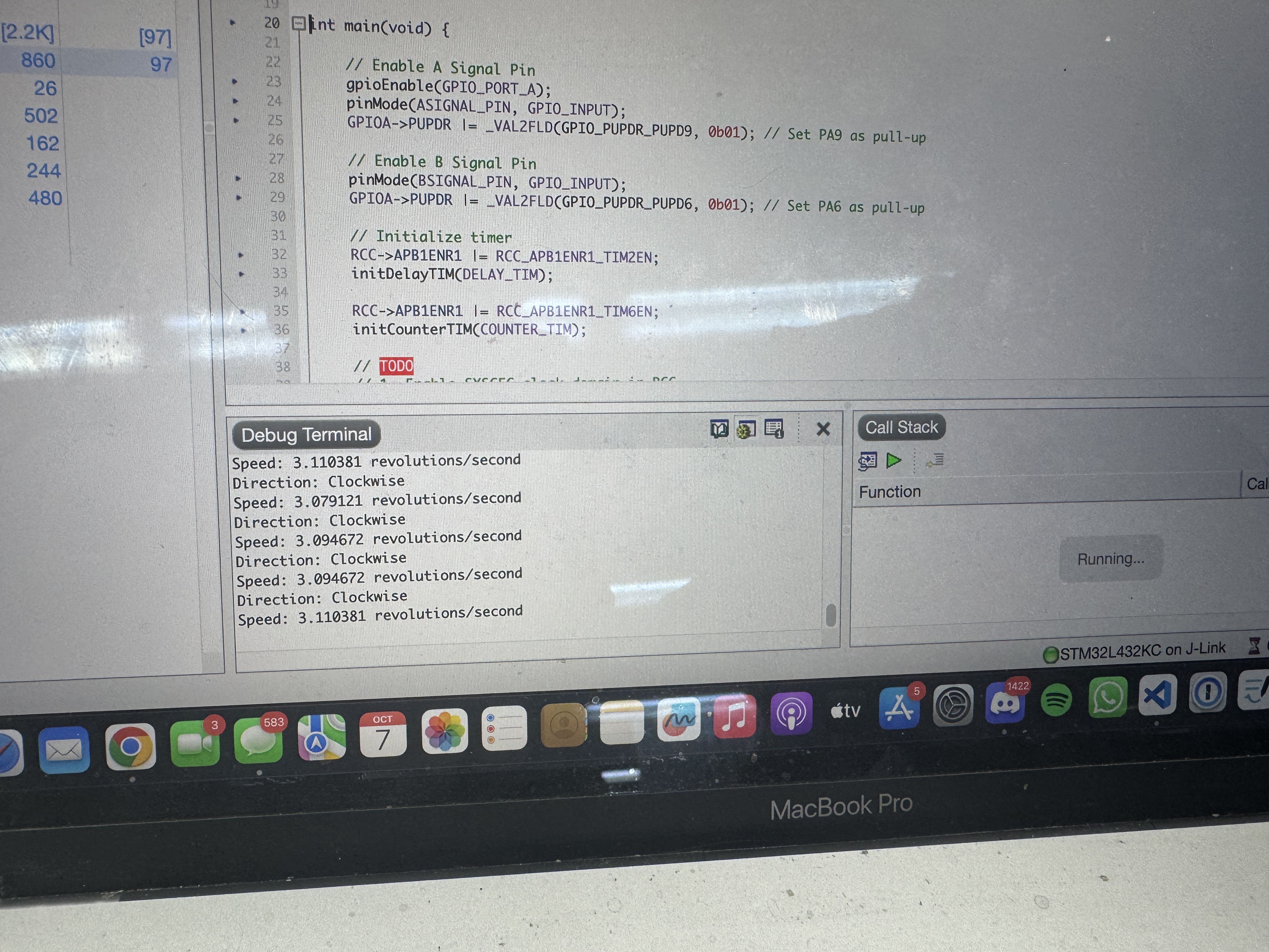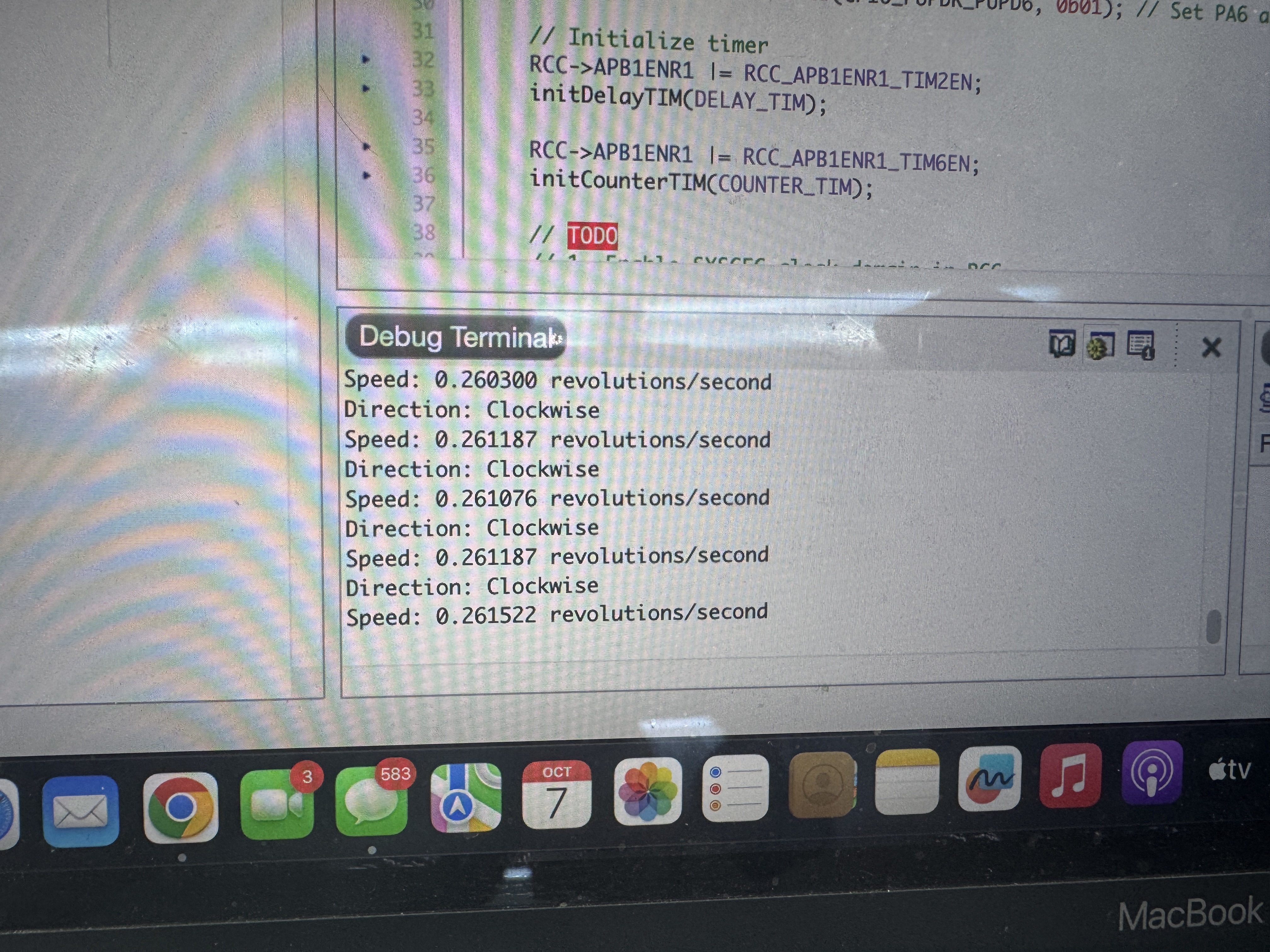 To tie everything together and actually run my code on the MCU, I had a main.h header file, and main.c file. I configured my timers, GPIO, and interrupts, and wrote my interrupt handling, and my speed calculations and printing. My code is as shows below: