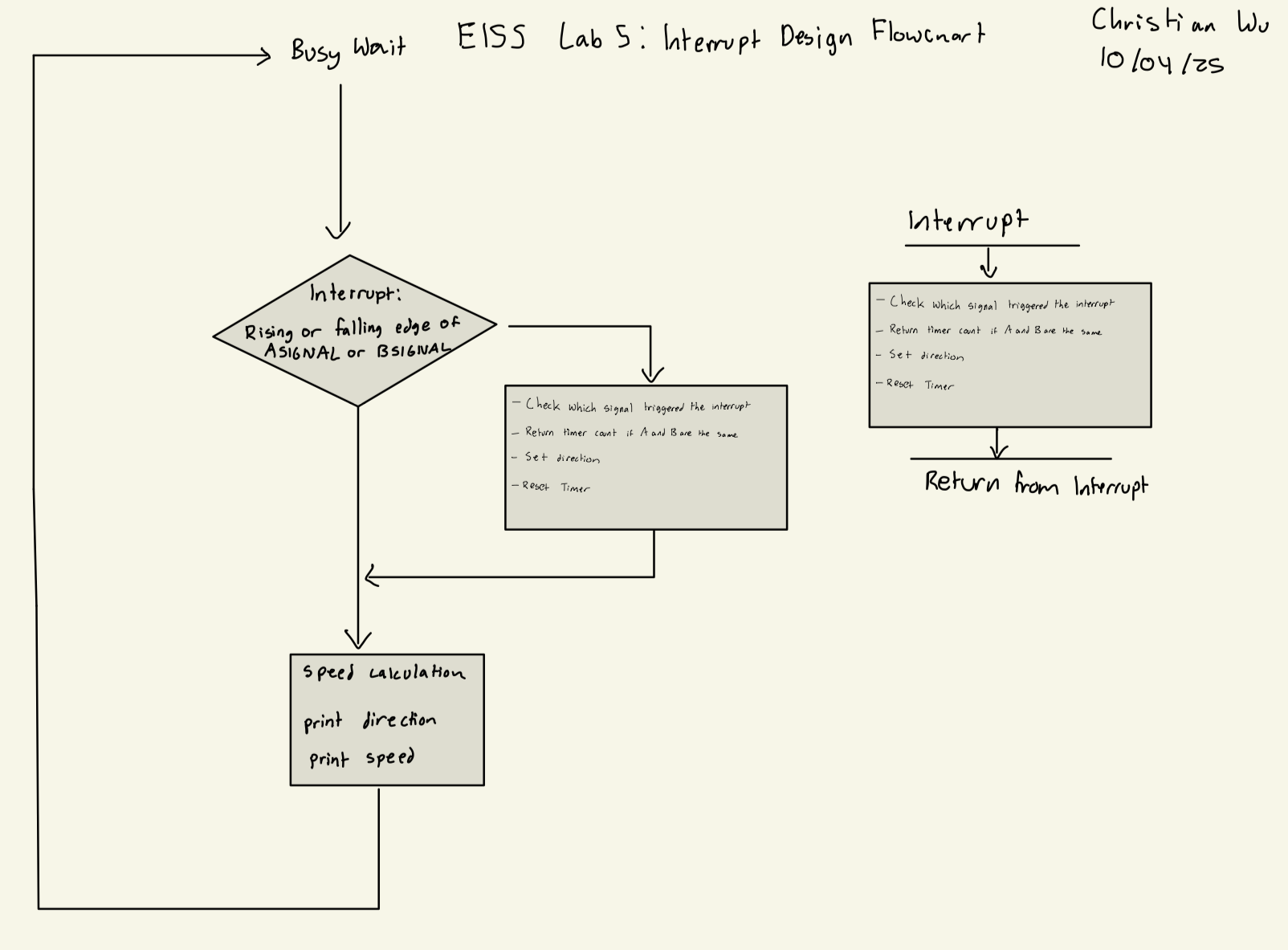 For the interrupts, I designed my code so that an interrupt would be triggered on a rising or falling edge of either ASIGNAL_PIN or BSIGNAL_PIN. Once the interrupt was triggered, the interrupt handler would determine which signal triggered the interrupt, and whether the value of both signals is the same. If they are the same, it would save the time difference between the two signals into deltaT. Then, it would reset the timer, and return from the interrupt. This can be seen in my interrupt design flowchart below:
