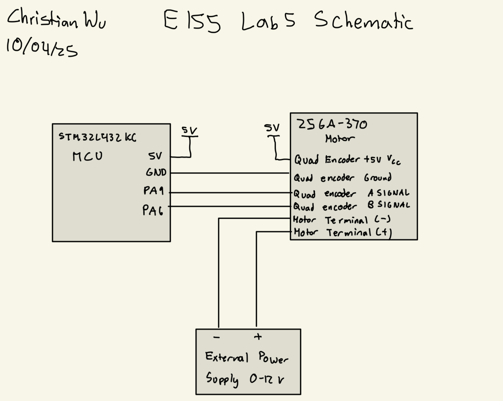 I can now build my hardware and program my MCU. I am using PA6, and PA9 for my two quadrature encoder signals, onboard 5V and ground to power the quadrature encoder, and an external power supply varying from 0 to 12 V to power the motor.