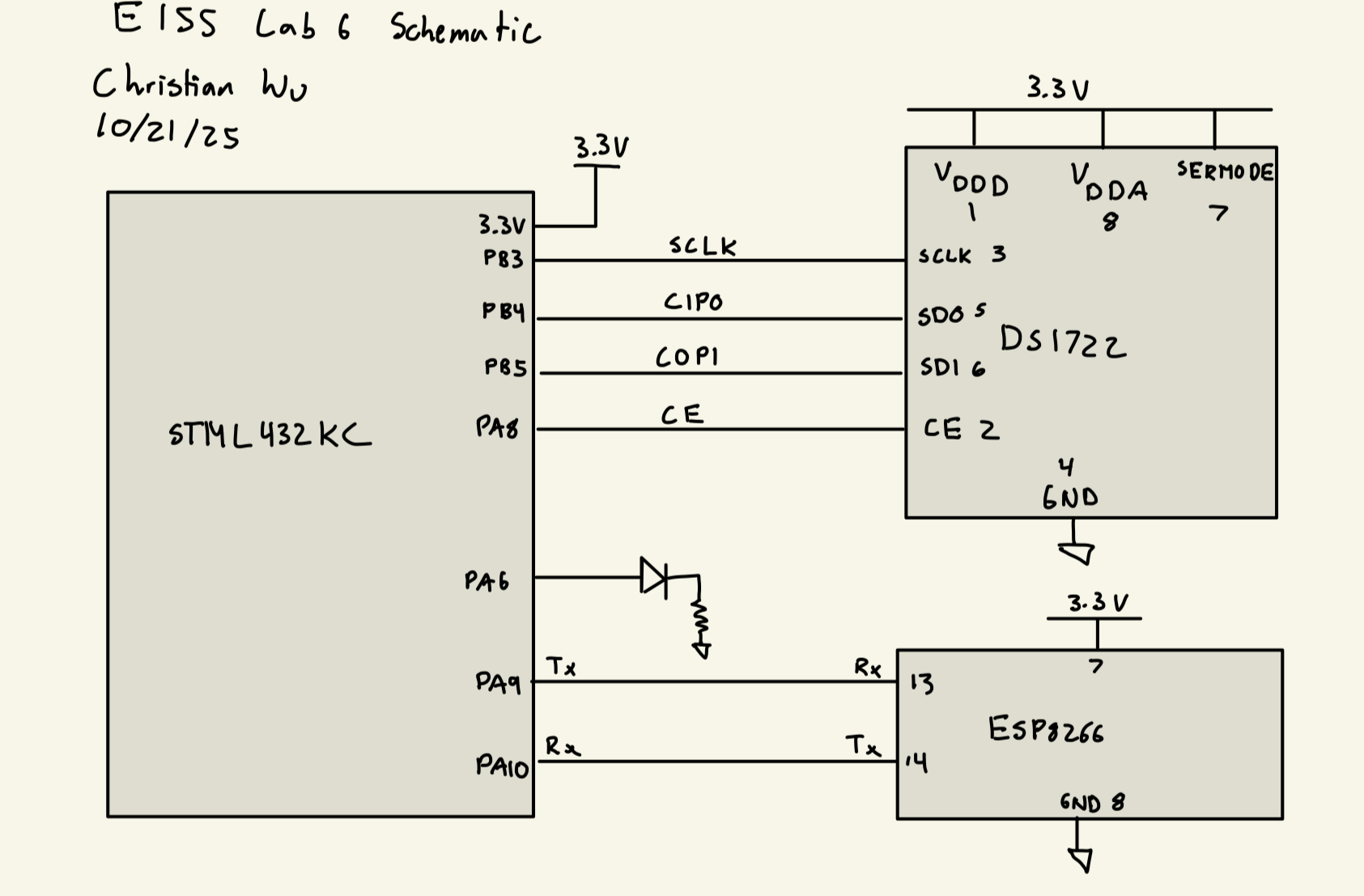For this lab, the MCU is using USART to communicate with the ESP8266 and SPI to communicate with the DS1722. The USART communication with the MCU and ESP8266 is done in my main.c file, and SPI code for DS1722 is done in a separate file.
